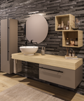 Set di mobili per il bagno caratterizzato da un design sostenibile grazie al top effetto legno Rovere naturale.