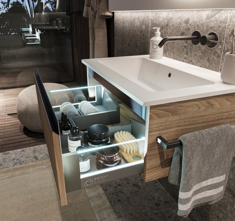 I nostri modelli con cassetto includono tutti la possibilità di scegliere l'opzione con le guide illuminate per le collection Zefiro e Riflesso.